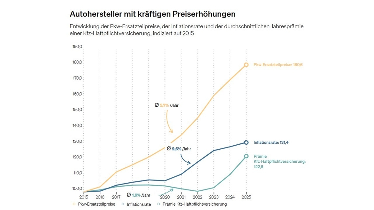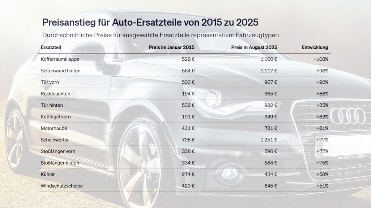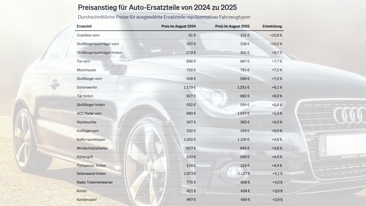 Der Trend der stetig steigenden Ersatzteilpreise setzt sich auch in diesem Jahr weiter fort. Wie der Gesamtverband der Deutschen Versicherungswirtschaft (GDV) in dieser Woche mitteilte, sind die Brutto-Preise für Scheinwerfer, Stoßfänger und Co. in den letzten zwölf Monaten um rund sechs Prozent gestiegen. „Zwischen August 2024 und August 2025 sind die Preise im Schnitt um knapp sechs Prozent gestiegen, bei einzelnen Teilen wie Vordertüren und Motorhauben sogar um rund acht Prozent“, sagt Jörg Asmussen, Hauptgeschäftsführer des GDV. ## Preiserhöhung zwischen 2 und 10 Prozent Den höchsten Preisanstieg verzeichnete seit August 2024 beispielsweise die Crashbox vorn. Die Brutto-Kosten stiegen von 91 Euro auf 101 Euro, ein Mehr von 10,8 Prozent innerhalb eines Jahres. Auch Scheinwerfer sind erneut teurer geworden und liegen nach einer Steigerung von 6,1 Prozent inzwischen bei 1.251 Euro. Mit einer 2,9-prozentigen Erhöhung auf 480 Euro war der Kondensator in vergangenen Jahr am preisstabilsten. ## Rund 80 Prozent teurer als 2015 Die aktuelle Entwicklung setzt einen seit Jahren anhaltenden Trend fort, wie Hauptgeschäftsführer Jörg Asmussen betont: „Die Kosten für Pkw-Ersatzteile steigen rapide und sind weitgehend unabhängig von der allgemeinen Preisentwicklung. Während der Verbraucherpreisindex seit 2015 um rund 30 Prozent zugenommen hat, erhöhten Autohersteller ihre Ersatzteilpreise durchschnittlich um über 80 Prozent.“ Kofferraumklappen und hintere Seitenwände sind heute etwa doppelt so teuer wie vor zehn Jahren. ## Quasi-Monopol der Hersteller bis 2045? Ein wesentlicher Treiber der anhaltenden Preissteigerungen ist der sogenannte Designschutz. Er schützt nicht nur das Fahrzeugdesign selbst, sondern auch sichtbare Ersatzteile wie Außenspiegel, Kotflügel oder Türen. Zwar trat bereits im September 2010 eine Gesetzesänderung mit der Ergänzung um die Reparaturklausel in Kraft, jedoch gilt diese vorerst nur für Autoteile, deren Design nach diesem Termin angemeldet wurde. Bis 2045, also noch zwei Jahrzehnte, bleiben die Rechte der Autohersteller erhalten. „Autofahrer und Werkstätten sind gezwungen, viele dieser Ersatzteile direkt vom Autohersteller zu kaufen“, kritisiert Jörg Asmussen. Dass der Markt nach Alternativen zu den teuren OE-Teilen sucht, spiegelt sich auch in den Diskussionen um gebrauchte Ersatzteile sowie in den Bemühungen wider, verstärkt IAM-Teile zu positionieren. Darüber hinaus setzen viele Werkstätten auf das Prinzip Instandsetzen vor Erneuern. ## GDV warnt: „Höhere Reparaturkosten belasten Versicherer“ Für die Kfz-Versicherer führen die steigenden Ersatzteilpreise zu deutlich höheren Reparaturkosten bei Unfällen. „Im vergangenen Jahr betrug der durchschnittliche Sachschaden in der Kfz-Haftpflichtversicherung eines Pkw rund 4.250 Euro, das sind