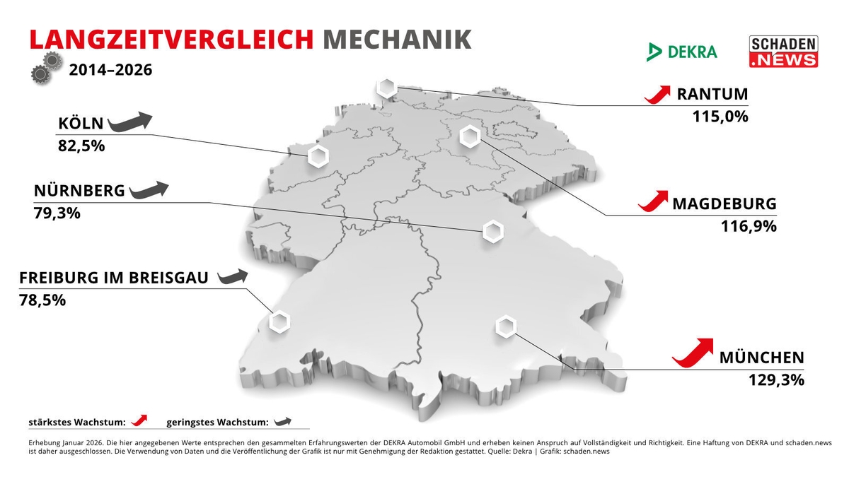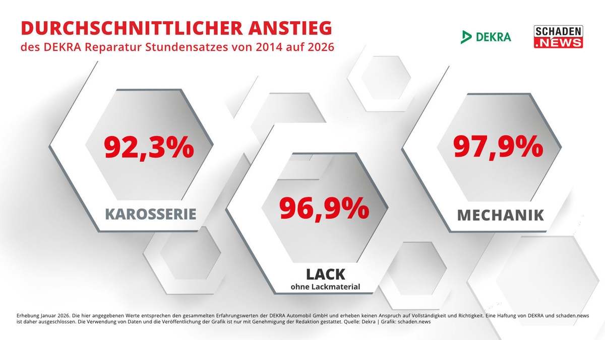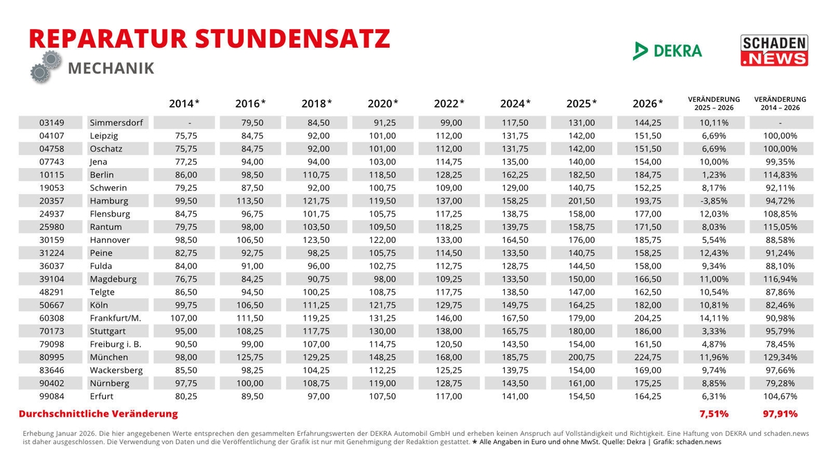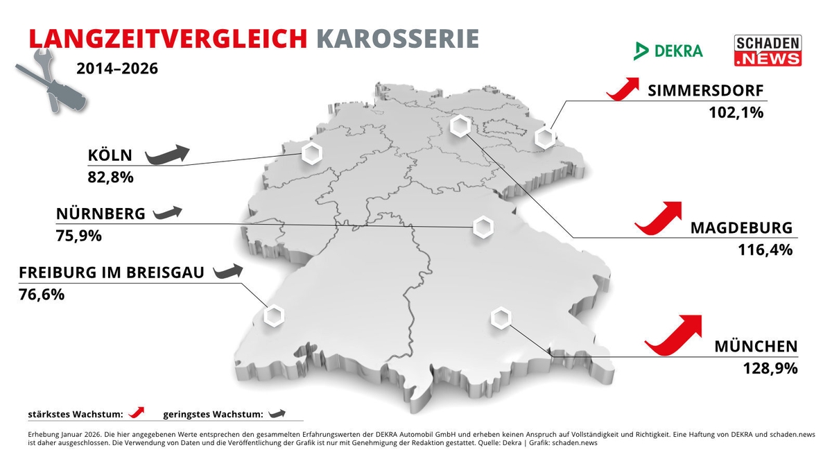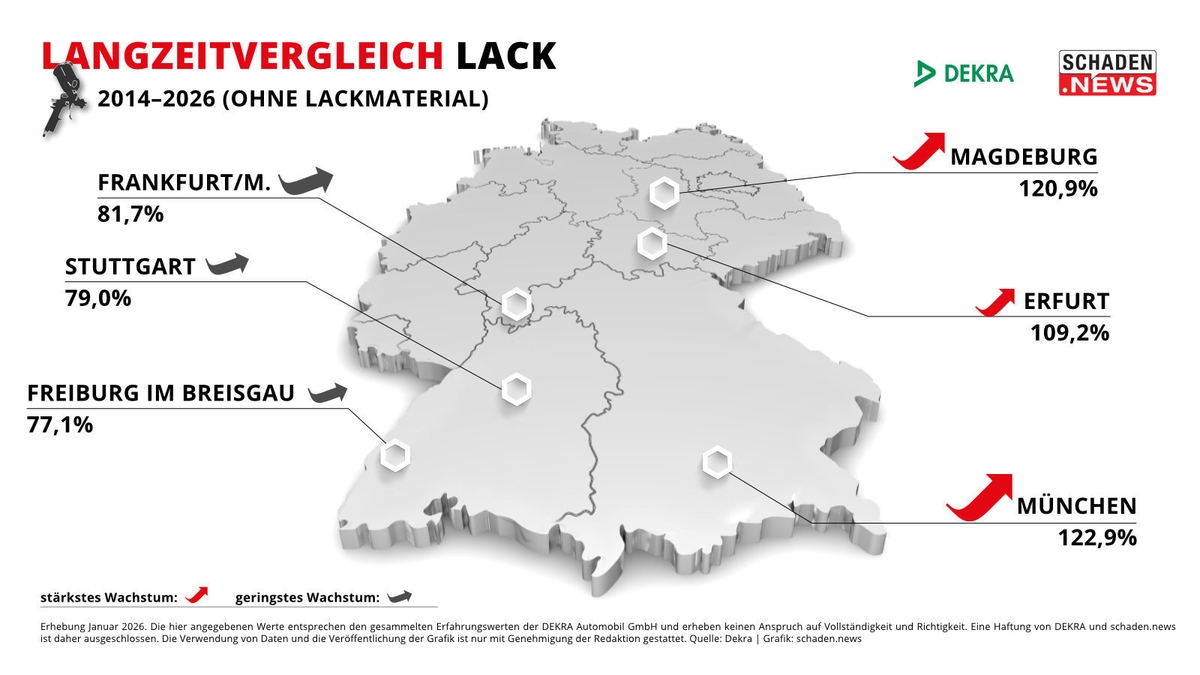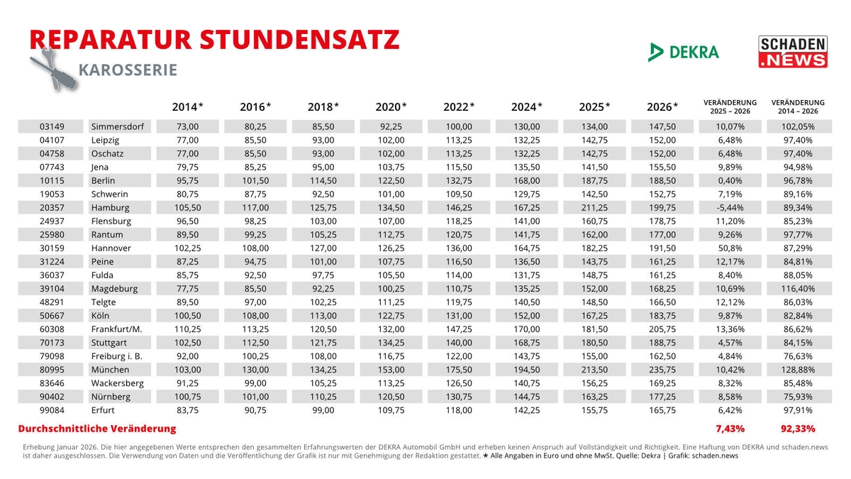 Bis zu 134 Euro mehr kostet die Reparaturstunde Lack (ohne Lackmaterial) heute im Vergleich zu 2014. Das zeigt der exklusive Langzeitvergleich des DEKRA Reparatur Stundensatzes (DRS), den schaden.news seit 2014 für insgesamt 22 Städte erhebt. Im Schnitt sind die Stundenverrechnungssätze über alle drei Gewerke – Mechanik, Karosserie und Lack (ohne Lackmaterial) – in den letzten 13 Jahren um 96 Prozent gestiegen. Spitzenreiter ist dabei, wie schon in den vergangenen Jahren, die bayerische Landeshauptstadt München mit einer durchschnittlichen Steigerung um 129,2 Prozent. Den geringsten Anstieg mit rund 77,9 Prozent in den letzten 13 Jahren verzeichnete das baden-württembergische Freiburg im Breisgau. ## Lackstunde ohne Lackmaterial um 96,9 Prozent gestiegen Betrachtet man die einzelnen Gewerke, so ist der Stundenpreis im Bereich Lack (ohne Lackmaterial) um 96,9 Prozent in den letzten 13 Jahren gestiegen. In Zahlen ausgedrückt bedeutet das: 2014 kostete die durchschnittliche Reparaturstunde 97,48 Euro, 2026 sind es 191,42 Euro – also knapp 94 Euro mehr. Eklatant sind dabei erneut die regionalen Unterschiede. Mit 82 Euro lag das brandenburgische Simmersdorf schon damals deutlich unter dem deutschlandweiten Durchschnitt. Und auch heute verzeichnet der Ort mit 165,25 Euro pro Lackstunde den niedrigsten Wert in der gesamten Bundesrepublik – und dass trotz einer prozentualen Steigerung von 101 Prozent seit 2014. Den stärksten Anstieg verzeichneten neben München die Städte Magdeburg (+120,9 % seit 2014) und Erfurt (+109,2 %). Mit 187,25 Euro bzw. 188,25 Euro in 2026 liegt der Lack-Stundensatz dennoch auch in diesen beiden Städten weit hinter dem der bayerischen Landeshauptstatt mit 243 Euro. ## Karosserie: Steigerungen zwischen 70 Euro und 132 Euro seit 2014 Ein ähnliches Bild zeigt sich im Bereich Karosserie. Im Vergleich zu Mechanik und Lack verzeichnet der Stundensatz hier mit 92,3 Prozent den niedrigsten Anstieg seit 2014 – jedoch ebenfalls mit erheblichen regionalen Unterschieden. Während in München (+ 128,9%), Magdeburg (+116,4%) und Simmersdorf (+102,1%) der DRS in den letzten 13 Jahren überdurchschnittlich gestiegen ist, verzeichnen Nürnberg (+75,9 %), Freiburg im Breisgau (+76,6%) und Köln (+82,8%) ein deutlich niedrigeres Wachstum. Wie groß die regionale Spanne tatsächlich ist, zeigt sich einmal mehr an den konkreten Zahlen: In München kostete die Karosseriestunde 103 Euro im Jahr 2014, inzwischen sind es 235,75 Euro. In Frankfurt am Main war der DRS Karosserie mit 110,25 Euro in 2014 sogar der höchste bundesweit, in der Mainmetropole entwickelte sich der Stundensatz jedoch deutlich unter dem Bundesdurchschnitt und liegt für 2026 bei 205,75 Euro (+86,6%). Den geringsten Anstieg gibt es laut DEKRA in Freiburg im Breisgau, wo sich der DRS Karosserie von 92 Euro in 2014 auf 162,50 Euro in 2026 erhöhte. ## Mechanik-DRS verzeichnet durchschnittlich größtes Wachstum in 13 Jahren Im direkten Vergleich hat sich der DRS Mechanik seit 2014 am stärksten erhöht – nämlich im Schnitt um 97,9 Prozent. Spitzenreiter sind auch in diesem Bereich die Städte München (+129,3 % seit 2014), Magdeburg (+116,9 %). Mit einer Steigerung von 115 Prozent in den letzten 13 Jahren verzeichnet zudem die schleswig-holsteinische Ortschaft Rantum auf Sylt. Dort kletterte der Stundensatz von 79,95 Euro in 2014 auf 171,50 Euro in 2026, gleichwohl die Preise im deutschlandweiten Vergleich im unteren Drittel liegen. Die Schlusslichter im Langzeitvergleich Mechanik sind abermals Freiburg im Breisgau mit einer Steigerung um 78,5 Prozent seit 2014, Nürnberg (+79,3 %) und Köln (+82,5 %).
