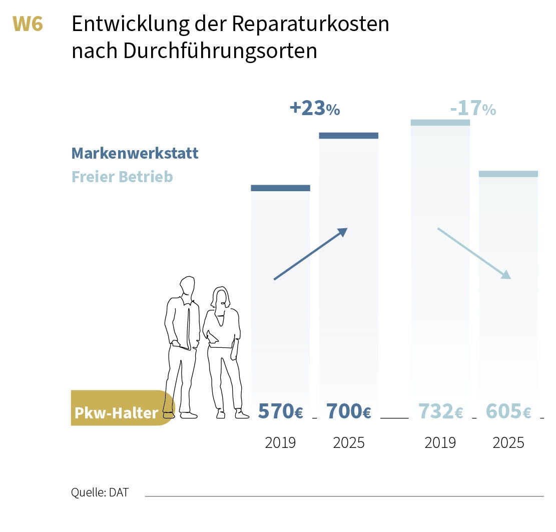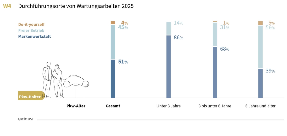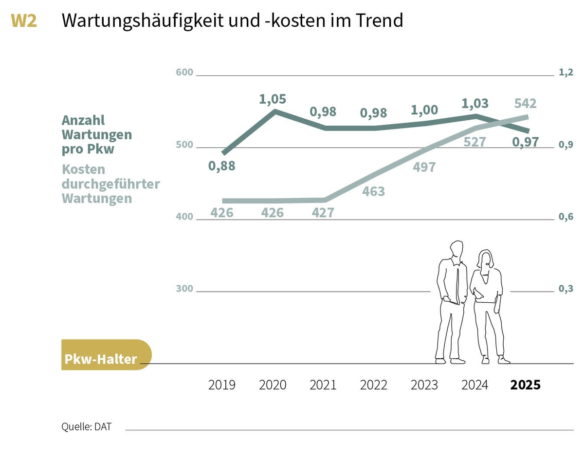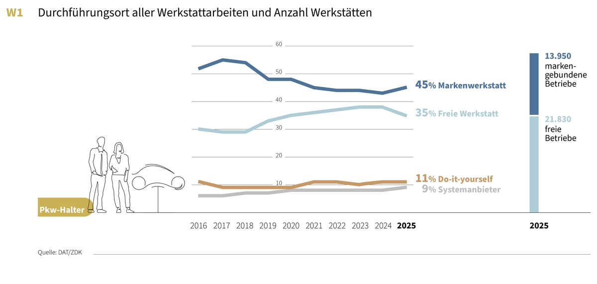 Am Dienstag, 27. Januar, wird in Berlin der DAT-Report 2026 vorgestellt. schaden.news hat in diesem Beitrag die wichtigsten Fakten aus den Kapiteln „Pkw-Halter als Werkstattkunde“ sowie „Antriebsarten“ zusammengefasst. ## Werkstattlandschaft: stabile Strukturen trotz leichter Rückgänge So zeigt sich die Werkstattlandschaft in Deutschland weiterhin robust, auch wenn sich die Zahl der Betriebe leicht reduziert hat. Im Jahr 2025 waren unter dem Dach des ZDK 13.950 Markenbetriebe organisiert, rund 100 weniger als im Vorjahr, sowie 21.830 freie Werkstätten, ein Rückgang um 150 Standorte. In der Verteilung der Arbeiten konnten die Markenbetriebe zulegen: 45 Prozent aller Werkstattaufträge entfielen auf sie, nach 43 Prozent im Jahr 2024. Freie Werkstätten kamen auf 35 Prozent und verloren damit leicht an Anteil. Dennoch bleibt die Bindung der Autofahrerinnen und Autofahrer an den Stamm-Betrieb ausgesprochen hoch. Neun von zehn Pkw-Haltern geben an, Wartungs- und Reparaturarbeiten stets in derselben Werkstatt durchführen zu lassen. Der Anteil jener, die die Werkstatt wechseln, liegt hingegen lediglich bei zehn Prozent – das unterstreicht einmal mehr die große Bedeutung von Vertrauen und gewachsenen Kundenbeziehungen. ## Wartung und Reparatur: weniger Termine, höhere Rechnungen Gleichzeitig verändert sich die Auslastung der Betriebe. Die Wartungshäufigkeit ging 2025 leicht zurück und sank von 1,03 auf 0,97 Wartungen pro Pkw. Demgegenüber stehen deutlich steigende Kosten: Mit durchschnittlich 542 Euro erreichten die Wartungsausgaben einen neuen Höchstwert und liegen damit 27 Prozent über dem Niveau von 2019. Wartungen wurden dabei häufiger in Markenwerkstätten durchgeführt, während sich mit zunehmendem Fahrzeugalter eine stärkere Verlagerung zu freien Betrieben zeigte. Ein ähnliches Bild ergibt sich bei Reparaturen. Die Häufigkeit von Verschleißreparaturen sank auf ein Allzeittief von 0,35 Reparaturen pro Pkw, das Kostenniveau blieb jedoch stabil bei etwas über 600 Euro. Parallel dazu steigt der finanzielle Druck auf Fahrzeughalter. 58 Prozent berichten laut DAT von einer grundlegend veränderten Beziehung zur Werkstatt: Viele beschränken sich auf das Notwendigste, vergleichen Angebote intensiver oder greifen vermehrt auf DIY-Lösungen zurück. 59 Prozent wären zudem bereit, zur Kostensenkung funktionstüchtige Gebrauchtteile einbauen zu lassen. ## Unfallschaden: Werkstatt bleibt erste Adresse Diese Kostensensibilität zeigt sich auch im Falle eines Unfallschadens. 22 Prozent der befragten Pkw-Halter hatten 2025 einen Unfall, doch nur 57 Prozent ließen den Schaden tatsächlich reparieren. Die durchschnittlichen Reparaturkosten stiegen dabei deutlich auf 2.353 Euro – im Vorjahr lag der Wert bei 2.166 Euro. Für Geschädigte bleibt die Werkstatt dennoch der zentrale Anlaufpunkt: 35 Prozent suchten im Schadenfall zuerst ihren Betrieb auf. Unfallverursacher hingegen wenden sich überwiegend zunächst an ihre Versicherung, was die unterschiedlichen Prioritäten von Reparatur und Kostenabsicherung verdeutlicht. ## Digitalisierung: erwartet, aber nicht ausschlaggebend Im Zuge dieser Entwicklungen gewinnt die Digitalisierung an Bedeutung, ersetzt den persönlichen Kontakt jedoch nicht. Softwareprobleme treten insbesondere bei jüngeren Fahrzeugen zunehmend auf und werden häufig im Rahmen von Wartungsterminen behoben. Gleichzeitig können sich 62 Prozent der Befragten vorstellen, Unfallschäden per Smartphone zu dokumentieren und per App an die Versicherung zu senden. Dennoch bleibt der Wunsch nach persönlicher Betreuung dominant: Nur drei Prozent bevorzugen einen vollständig digitalen Schadenprozess, und auch bei der Online-Terminbuchung zeigt sich die Kundschaft weiterhin gespalten. ## E-Mobilität: Erfahrung schafft Offenheit Vor diesem Hintergrund lohnt der Blick auf die Antriebswende. Rund 30 Prozent der befragten Pkw-Halter sind bereits ein E-Fahrzeug gefahren. Diese Erfahrungen wirken sich spürbar auf die Einstellung aus: Fahrspaß und Alltagstauglichkeit werden von BEV-Erfahrenen deutlich positiver bewertet. Gleichzeitig bleiben Ladeinfrastruktur, Anschaffungspreis und die Batterie als Unsicherheitsfaktor zentrale Kritikpunkte. 74 Prozent der BEV-Nutzer bestätigen zudem den Einfluss der Witterung auf die Reichweite. Dennoch zeigt sich eine klare Trendwende: Mit 40 Prozent ist der Anteil derjenigen, die sich einen Umstieg vorstellen können, inzwischen höher als der Anteil der Skeptiker.