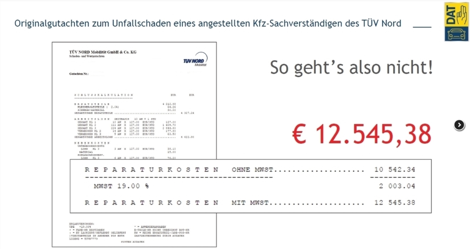 Die fehlenden Informationen führten dazu, dass einige der Sachverständigen und Karosseriebauer, die sich beteiligt hatten, eine Bandbreite für den Schaden angaben, die zum Teil mehrere Tausend Euro betrug. Andere legten sich auf einen Betrag fest. Von 2.700 bis 8.500 Euro reichten die Schätzungen der Reparaturkosten allein anhand der Bilder. Zeitgleich ließ die DAT den Schaden durch einen Sachverständigen vor Ort begutachten und kalkulieren. Sein Schadengutachten weist Reparaturkosten inklusive Umsatzsteuer in Höhe von 12.545,38 Euro (Reparaturdauer 7-9 Arbeitstage) aus. Die Wertminderung bezifferte er mit 1.250,00 Euro. Der Fall zeigt, wie hart diese Problematik Kfz-Besitzer treffen könnte. Martin Endlein fasst zusammen: "Im Extremfall, basierend auf unserer Umfrage, bliebe ein Geschädigter auf rund 10.000 Euro Schaden sitzen."