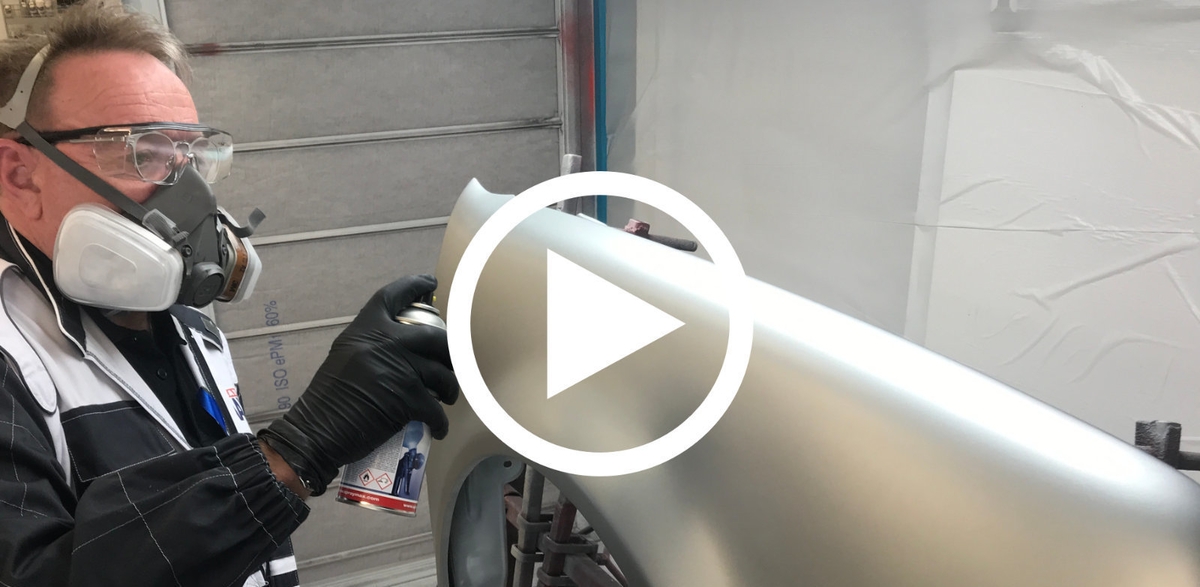 „Die spezielle Formulierung der SprayMax 1K und 2K Lackspraydosen gewährleistet eine gleichbleibende Ausbringmenge vom ersten Sprühstoß, bis die Aerosoldose komplett leergesprüht ist“, erklärt der Experte und fügt hinzu: „Diese konstante Druckabgabe bildet die Voraussetzung, um auch komplette Bauteile lackieren zu können.“ Um dem Decklack eine optimale Haftung zu bieten, trägt Ralf Ertle im Video auf einen bereits gefüllerten Kotflügel zunächst SprayMax 1K Spot-Grundierer in dünnen Schichten auf, bis eine Trockenfilmschichtdicke von 3 bis 5 µm erreicht ist. Die laut Hersteller sehr guten Korrosionsschutzeigenschaften des Zinkchromat-freien 1K Primers nutzt Ertle zudem, um Durchschliffstellen an Kanten, Ecken und Sicken des Bauteils zu isolieren. Bereits nach zehnminütiger Trocknungszeit könne der Auftrag des Wasserbasislacks erfolgen. Um zu demonstrieren, dass auch anspruchsvolle Farbtöne mit der Dose lackiert werden können, verwendet Ralf Ertle im Video einen zuvor mit dem FillClean-System abgefüllten Porsche-Silberfarbton mit einer Zwischenablüftzeit von 5 bis zehn Minuten.