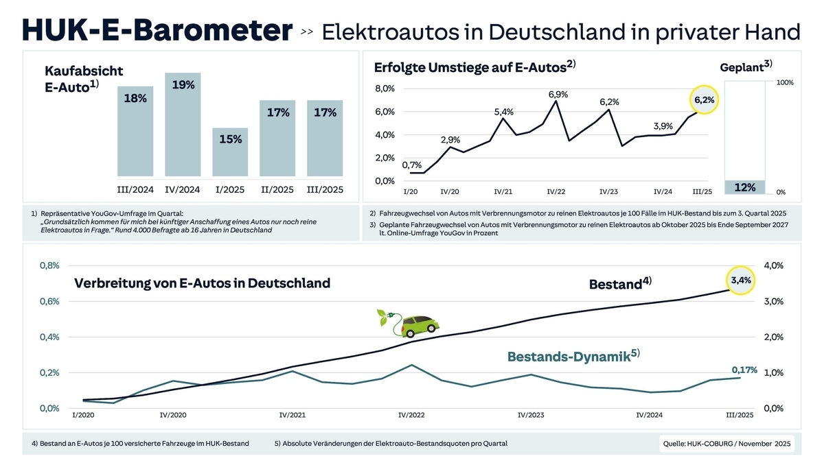 Die HUK-Coburg verzeichnet im dritten Quartal 2025 den stärksten Umstieg von privaten Pkw-Haltern auf reine Elektrofahrzeuge seit zwei Jahren. Das geht aus dem aktuellen E-Barometer des Versicherers hervor. Demnach wechselten im Q3 rund 6,2 Prozent der HUK-Kunden bei einem Fahrzeugtausch vom Verbrenner zum E-Auto – nach 5,5 Prozent im vorherigen Quartal. Seit dem Tiefpunkt Anfang 2024 hat sich die Umstiegsquote damit mehr als verdoppelt. Dennoch bleibt der E-Auto-Bestand im Privatmarkt weiterhin niedrig: Selbst in Spitzenländern wie Bayern liegt der Anteil reiner Elektro-Pkw erst bei unter vier Prozent. ## Privatkunden treiben Nachfrage – trotz schwachem Gesamtmarkt Der neue HUK-Trend steht im Gegensatz zum zuletzt schwachen Gesamtmarkt für Elektroautos. Branchenverbände wie der ZDK warnen seit Monaten vor rückläufiger Nachfrage und einer Marktverzerrung durch hohe Eigenzulassungen der Hersteller. Diese kaschierten, dass der BEV-Markt ohne staatliche Prämien auf wackeligen Beinen stehe. Genau dieser Effekt zeigte sich 2024 nach dem abrupten Förderstopp: Die privaten Neuzulassungen brachen damals ein – was sich auch in der HUK-Datenbasis widerspiegelte. Umso bemerkenswerter ist die aktuelle Bewegung im Versichertenbestand der HUK-Coburg. Häufigster Umstiegsgrund bleibt laut Studie der sinkende Gesamtbetriebskosten-Vorteil, dazu kommen ein wachsendes Angebot gebrauchter Modelle sowie ein etwas entspannterer Gebrauchtwagenmarkt. ## Gebrauchte E-Autos gewinnen an Bedeutung Ebenfalls bemerkenswert: Bereits über 50 Prozent der Wechsel auf ein E-Auto entfallen laut E-Barometer inzwischen auf ein gebrauchtes Fahrzeug – ein massiver Sprung gegenüber 2020, als es noch rund zehn Prozent waren. Am beliebtesten sind hier Modelle wie der VW ID.3, während bei Neuwagen der erst 2025 eingeführte Skoda Elroq führt. Für den Gesamtmarkt könnte diese Verschiebung entscheidend sein. Denn während Neufahrzeuge für viele Privatkunden weiterhin teuer bleiben, nähert sich der Gebrauchtwagenpreis bei einigen E-Modellen inzwischen konventionellen Verbrennern an. ## Regionale Unterschiede weiter sichtbar Auffällig sind außerdem deutliche Unterschiede bei Hybridfahrzeugen. Besitzer von Plug-in-Hybriden wechseln später laut HUK-Daten dreimal so häufig zu reinen Elektroautos wie Fahrer von Mild- oder Vollhybriden. An der regionalen Verteilung hat sich hingegen wenig geändert: Bayern und Niedersachsen bleiben mit jeweils knapp vier Prozent E-Auto-Anteil führend. Deutlich darunter liegen weiterhin die ostdeutschen Bundesländer, wo sowohl der Bestand als auch die Wechselquote nur ungefähr halb so hoch sind. ## Wiedereinführung der E-Auto-Prämie könnte zusätzlichen Schub geben Einen zusätzlichen Schub für den privaten Kauf privater E-Autos könnte die ab 2026 geplante Förderung bringen. Die Bundesregierung plant für 2026 eine reformierte Kaufprämie, vorgesehen sind 3.000 EUR Basisförderung, die je Kind um 500 Euro – maximal jedoch um 1.000 Euro – steigen kann. Für besonders einkommensschwache Haushalte ist eine zusätzliche Aufstockung geplant. Anders als bisher soll es zudem auch eine Regelung für die Förderung gebrauchter Elektrofahrzeuge geben. Branchenverbände, wie der ZDK, begrüßen die Entscheidung der Regierungskoalition und gehen davon aus, dass die Förderung den Absatz von E-Autos beflügelt. Mit Blick auf die HUK-Ergebnisse könnte die Kaufprämie vor allem für die Gruppe der unter 40-Jährigen interessant werden: Sie bewerten E-Autos zwar deutlich positiver als ältere Fahrer, steigen aber wegen der hohen Preise bislang seltener tatsächlich um.