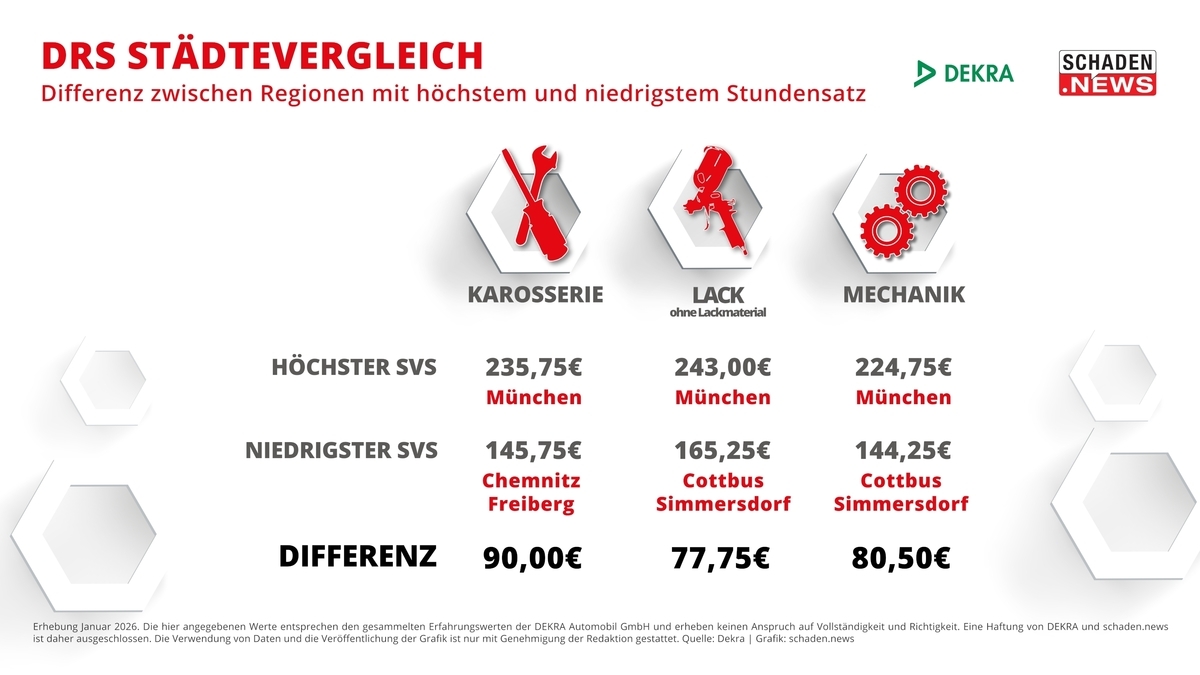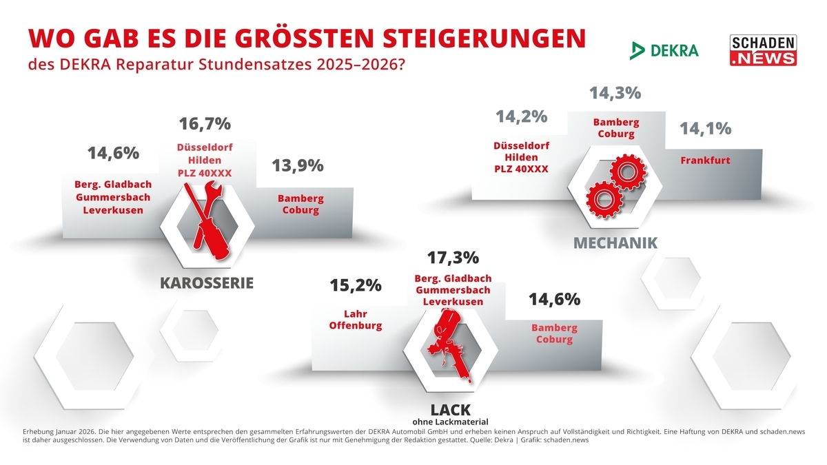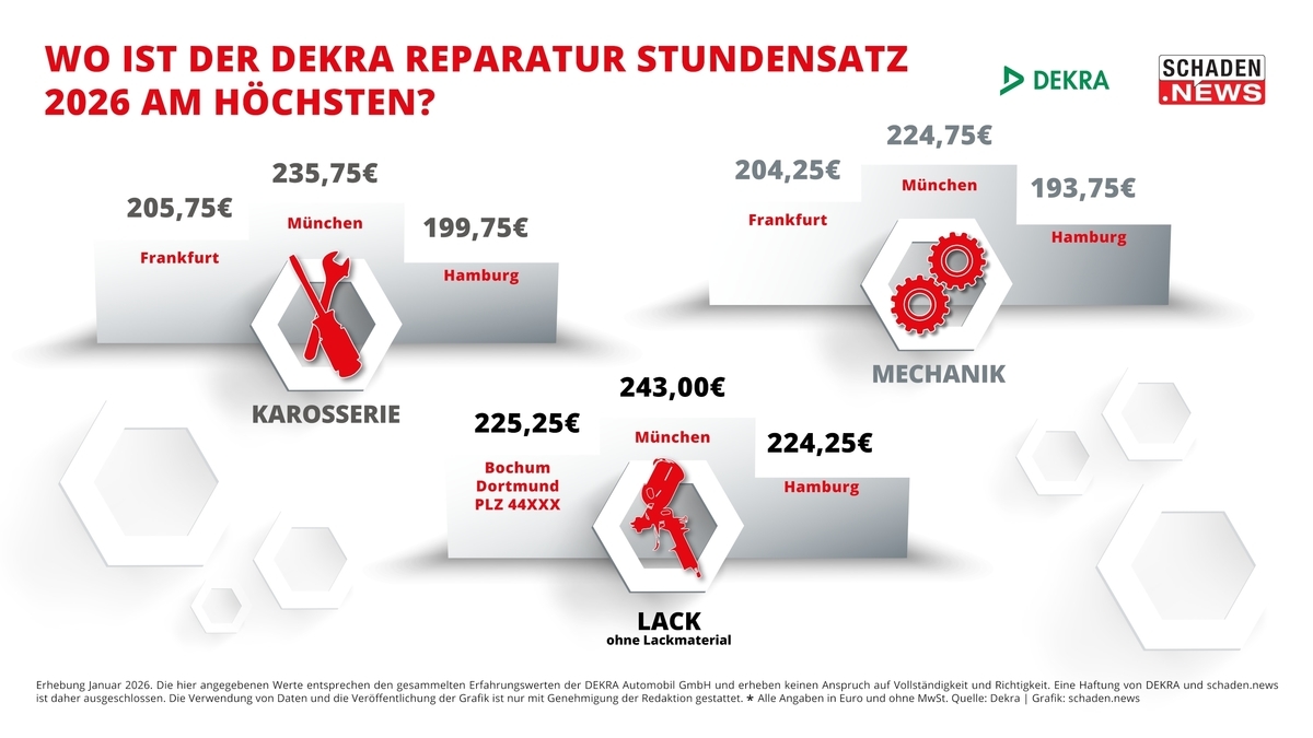 Die DEKRA Reparatur Stundensätze (DRS) sind im vergangenen Jahr erneut gestiegen. Allerdings fällt das Wachstum nicht ganz so krass aus wie noch 2025 oder 2024. Lagen damals die Steigerungen bei über 9 Prozent, so sind es nun, zum Beginn des Jahres 2026, im Schnitt nur noch 7,5 Prozent Steigerung. Das zeigt die schaden.news-Auswertung der DEKRA Reparatur Stundensätze in den Gewerken Karosserie, Lack (ohne Lackmaterial) und Mechanik für mehr als 300 Orte in ganz Deutschland. Als einziges Fachmedium um Kfz-Unfallschadenmarkt dokumentiert schaden.news Jahr für Jahr diese Daten und wertet sie aus. Bereits bei der Jubiläumssendung des Schadentalk im Web-TV im November 2025 hatte Christoph Mennicken, Head of Digital C&E Services der Region Deutschland, Österreich und Schweiz bei DEKRA und Erfinder des DRS, [eine Seitwärtsbewegung des DEKRA Reparatur Stundensatzes für 2026 prognostiziert](https://schaden.news/de/article/link/44840/schadentalk-web-tv-jubilaeumssendung-zusammenfassung). ## Karosserie: Bis zu 90 Euro Unterschied je nach Region Der DRS in der Karosserie ist seit der Auswertung im vergangenen Jahr um 7,4 Prozent gestiegen. Durchschnittlich kostete eine Reparaturstunde in diesem Gewerk 173,94 Euro. Das größte Wachstum innerhalb eines Jahres verzeichnet das Postleitzahlengebiet 40XXX mit den Städten Düsseldorf und Hilden (16,7 Prozent Zuwachs). Ebenfalls starke Steigerungen waren in Bergisch Gladbach, Gummersbach und Leverkusen zu vermelden (14,6 Prozent Steigerung). Die höchsten Reparaturstundensätze gab es im vergangenen Jahr in München (235,75 Euro), Frankfurt/M. (205,75 Euro) und Hamburg (199,75 Euro). Den niedrigsten Stundensatz in der Karosserie verzeichneten die sächsischen Städte Chemnitz und Freiberg mit 145,75 Euro – das sind satte 90 Euro weniger als beim Spitzenreiter München. ## Lackierung: München erneut Spitzenreiter Apropos Spitzenreiter: Auch im Gewerk Lack (ohne Lackmaterial) führt die bayrische Landeshauptstadt die Liste der Städte mit dem höchsten Reparatur Stundensatz an. Dort lag er im vergangenen Jahr bei 243 Euro. Das sind rund 50 Euro mehr als der bundesweite Durchschnitt für den DRS im Lack (192,87 Euro). Im Vergleich zum DRS 2025 entspricht das einer Steigerung von 7,5 Prozent. Die rote Laterne bei den Stundensätzen im Lack hält übrigens auch in diesem Jahr die Region um Cottbus und Simmersdorf mit 165,25 Euro. ## Mechanik: Durchschnittlicher DRS liegt bei 141,43 Die Mechanik ist bereits seit Jahren das Gewerk mit dem im Schnitt niedrigsten DEKRA Reparatur Stundensatz. Zu Beginn des Jahres 2026 liegt er bei 141,43 Euro – im Vergleich zum Vorjahr verzeichnet er aber ebenfalls eine Steigerung um 7,5 Prozent. Das stärkste Wachstum in der Mechanik gab es in Bamberg und Coburg (14,3 Prozent), gefolgt von Düsseldorf und Hilden (14,2 Prozent). Den niedrigsten DEKRA Stundensatz haben erneut Cottbus und Simmersdorf. ## Kompakte Infos zu einem komplexen Thema Die Werte auf bestimmte Regionen herunterbrechen, in den Marktzusammenhang einordnen, für die eigenen Stundensatzverhandlungen nutzen und sich einfach besser informieren: schaden.news liefert Ihnen nicht nur exklusiv die aktuellen Entwicklungen zum DEKRA Reparatur Stundensatz, sondern ein umfangreiches Infopaket. Wie hoch ist der DEKRA Reparatur Stundensatz in Ihrer Region im Jahr 2026 im Detail? [Klicken Sie sich in unsere Deutschland-Karte, wählen SIe Ihre Postleitzahl aus und erfahren Sie es!](https://schaden.news/de/map/dekra-stundensaetze-karte) [Wie kommt der DRS überhaupt zustande und welchen Stellenwert hat er in der Branche? Im Gastbeitrag ordnet Berd Grüninger, Leiter Schadengutachten bei DEKRA, die neuesten Entwicklungen des DRS ein.](https://schaden.news/de/article/link/44866/gastbeitrag-bernd-grueninger-dekra-drs) [Was müssen K&L-Betriebe beim Verhandeln ihres Stundensatzes jetzt beachten? Und was können Werkstätten noch tun, um sich profitabler aufzustellen? Die wichtigsten Tipps und Hinweise hat schaden.news gemeinsam mit der Unternehmensberaterin Marina Markanian von der bpr Mittelstandsberatung zusammengestellt.](https://schaden.news/de/article/link/44868/bwl-tipp-verhandlung-von-stundensaetzen) Langzeitvergleich: Wie sich der DEKRA Reparaturstundensatz seit Beginn der schaden.news-Erhebung 2014 bis 2026 in 22 Orten Deutschlands entwickelt hat, lesen Sie in der kommenden Woche auf schaden.news.