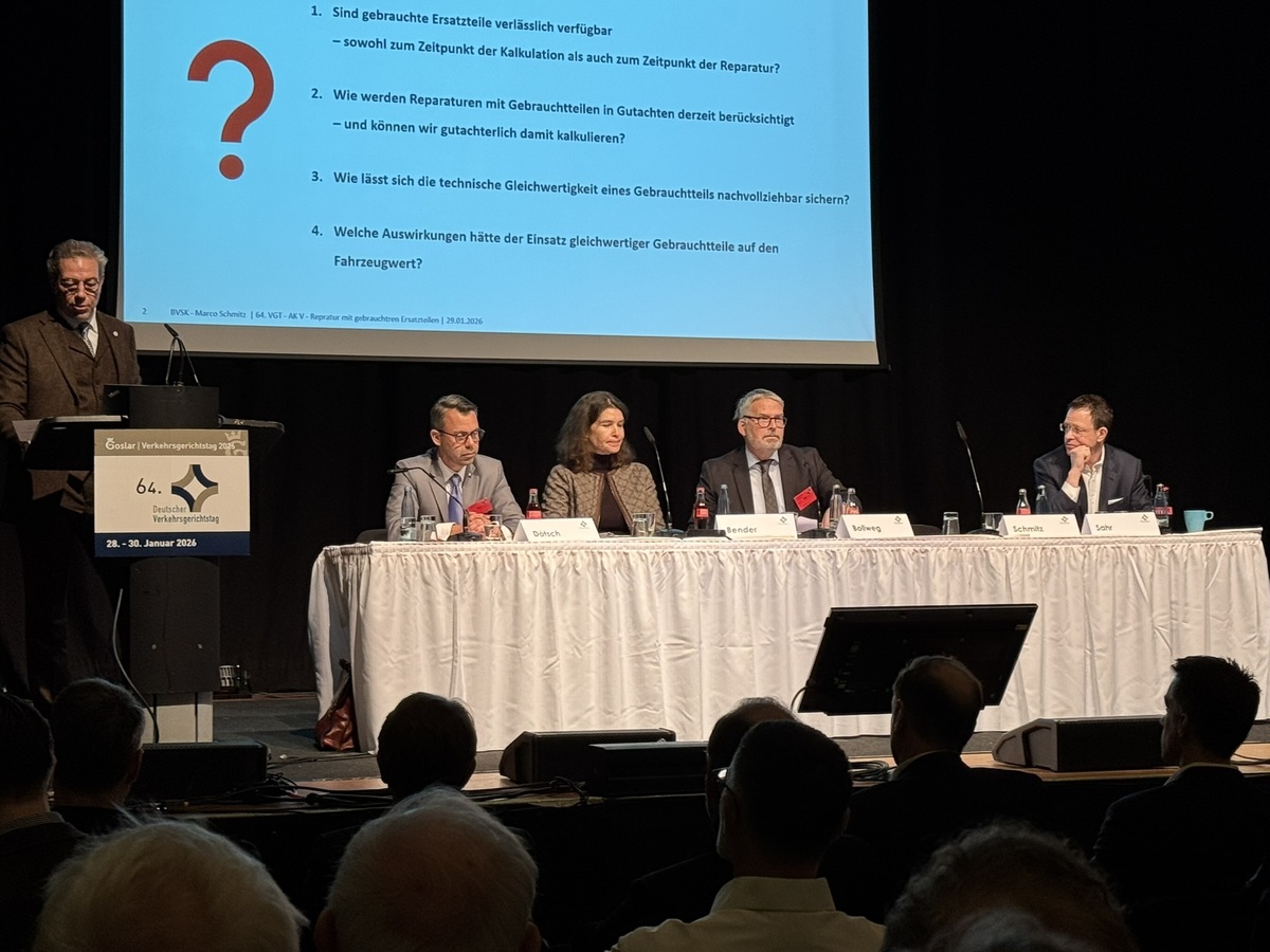 Bei bestem Winterwetter stapften mehr als 1.000 Teilnehmerinnen und Teilnehmer Ende Januar (28.-30.1.2026) durch den Schnee im frostigen Goslar. Für drei Tage trafen sich in der Stadt im Harz Rechtsanwälte, Richter, Sachverständige, Kfz-Versicherer und weitere Experten zum 64. Deutschen Verkehrsgerichtstag, der Empfehlungen zu verschiedenen verkehrspolitischen Themen beschließt. Unter den Gästen waren diesmal auch viele Interessierte aus dem Schaden Business. Denn auf der Tagesordnung des Arbeitskreises V des Verkehrsgerichtstages stand in diesem Jahr der Einsatz von Gebrauchtteilen in der Unfallschadenreparatur. ## Viel Veränderung in den vergangenen Jahren Vor dem Hintergrund der Einigung zur EU-Altautoverordnung Ende 2025 erwarten die Experten in den nächsten Jahren mehr Relevanz von Gebrauchtteilen in der Unfallschadenreparatur, da die Regelung sehr viel mehr Recycling von Fahrzeugkomponenten vorschreibt. Dies verändere die Situation im Vergleich zu den Vorjahren. Bereits vor knapp drei Jahrzehnten Stand das Thema gebrauchte Ersatzteile schon einmal auf der Agenda beim Deutschen Verkehrsgerichtstag. Seitdem habe sich viel verändert erklärten die Experten bei der Diskussion im Arbeitskreis. Hier stellten unter anderem Dr. Christian Sahr (Allianz Zentrum für Technik) und Marco Schmitz, Kfz-Gutachter und Vize-Präsident des Bundesverbandes freiberuflicher Sachverständiger (BVSK) etwas gegensätzliche Positionen dar. Das Allianz Zentrum für Technik betonte vor allem die wirtschaftlichen, ökologischen und technischen Aspekte, während die Seite der Sachverständigen eher eine kritischere Haltung aufgrund von fehlenden praxistauglichen Standards, Strukturen und Volumen einnahm. ## Was hat der Verkehrsgerichtstag beschlossen? Der Arbeitskreis V hat nach abschließender Beratung empfohlen, dass „künftig bei Kasko- und Kfz-Haftpflichtschäden verstärkt auf gebrauchte Ersatzteile zurückgegriffen werden soll, wenn der Schaden technisch und wirtschaftlich nur durch den Austausch von Bauteilen behoben werden kann.“ Die Experten sehen darin einen wichtigen Beitrag, um Reparaturkosten zu begrenzen und zugleich ökologische Vorteile zu nutzen. Gerade vor dem Hintergrund steigender Schadenaufwendungen erhält der Vorstoß zusätzliche Relevanz für Versicherer und Werkstätten. ## Gebrauchtteile als gleichwertige Reparaturoption Nach Auffassung des Arbeitskreises kann eine Reparatur mit Gebrauchtteilen einen Unfallschaden ebenso fachgerecht beheben wie der Einsatz von Neuteilen. Voraussetzung ist, dass das gebrauchte Teil dem beschädigten Bauteil in Art und Güte entspricht und der Ersatzanspruch des Geschädigten vollständig erfüllt wird. Zudem muss dem Geschädigten eine solche Reparatur zumutbar sein. Das bedeutet insbesondere, dass die benötigten Teile ohne nennenswerte zeitliche Verzögerung und in zumutbarer regionaler Nähe beschafft werden können. Unter diesen Bedingungen
